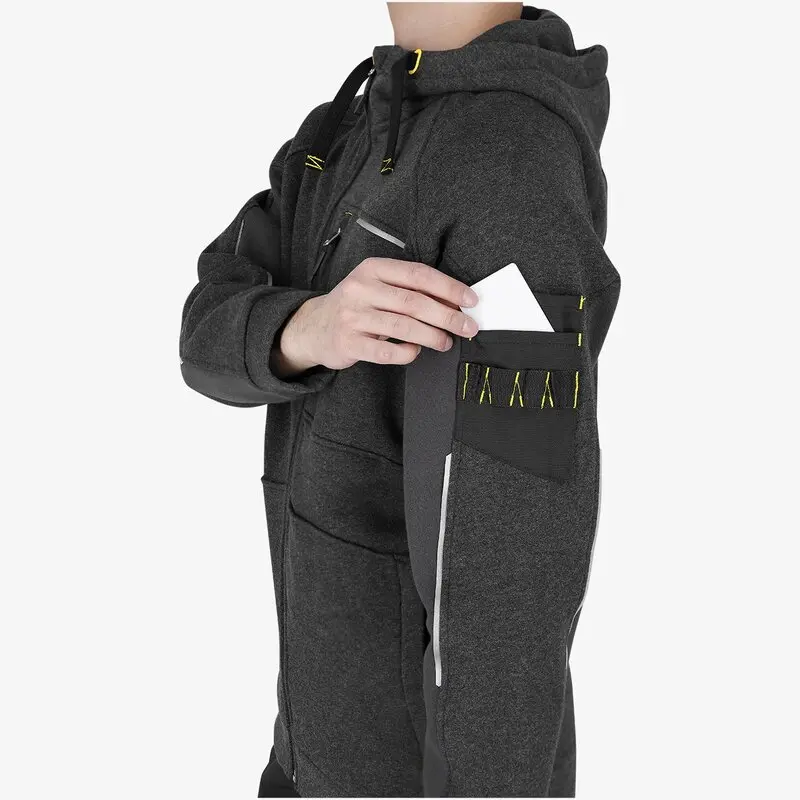 Ευέλικτο φούτερ με κουκούλα που λειτουργεί τόσο στη δουλειά όσο και στον ελεύθερο χρόνο. Το φούτερ DENEB έχει μελανζέ υφή, σταθερή κουκούλα και κορδόνια περίσφιξης για να ρυθμίζετε την εφαρμογή της κουκούλας. Διαθέτει 2 τσέπες καγκουρό, μια εκτυπώσιμη τσέπη στο στήθος και μια στρατηγικά τοποθετημένη τσέπη εργαλείων στο μανίκι για πρακτική αποθήκευση αξεσουάρ και εργαλείων. Το καπάκι προστασίας από τον αέρα και το κρύο προστατεύει, ενώ η προστασία στο πηγούνι εμποδίζει το δέρμα και τις τρίχες να πιαστούν στο φερμουάρ. Με ανακλαστικά στοιχεία σχεδιασμού για μια μοντέρνα πινελιά.